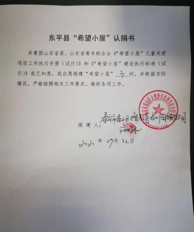 东平姜玉坤眼镜店爱心捐赠“希望小屋”1间