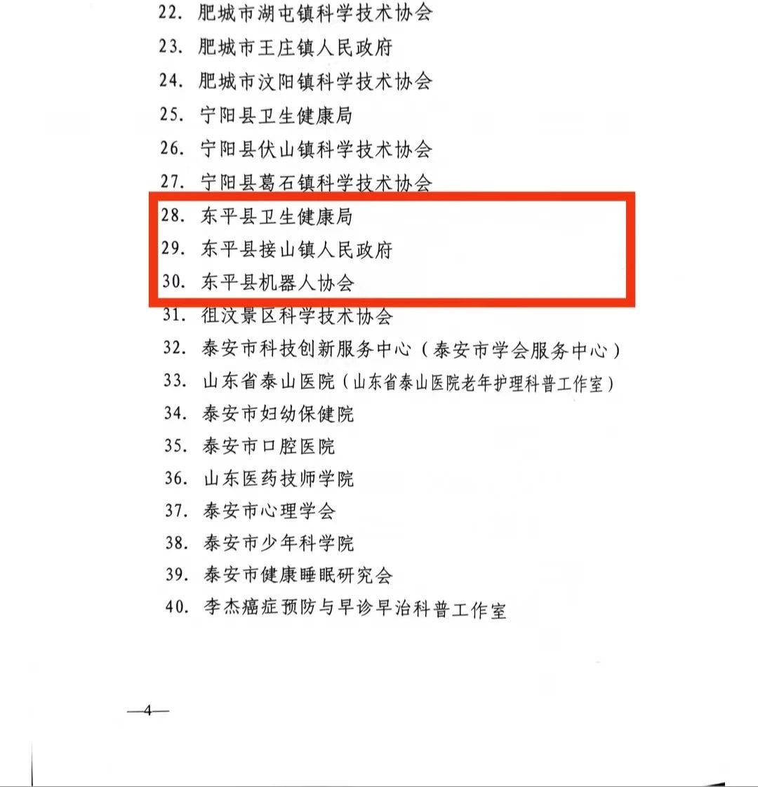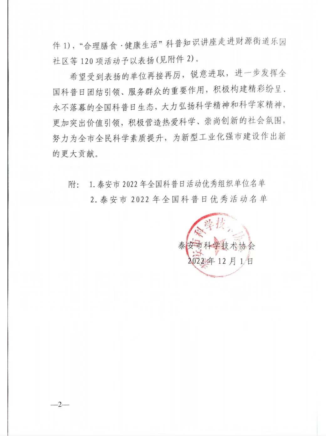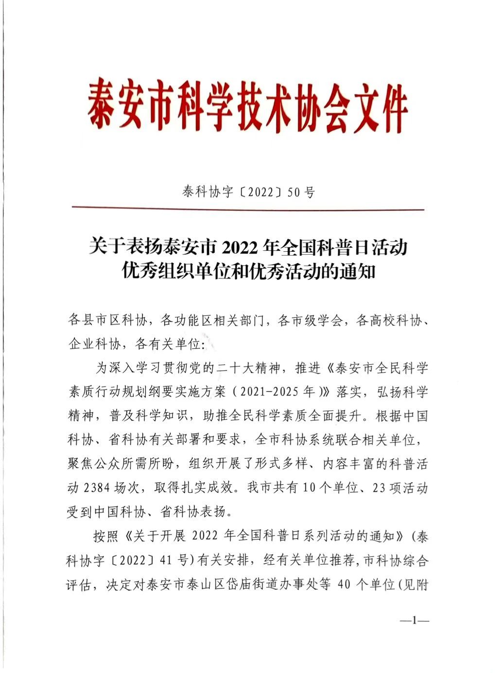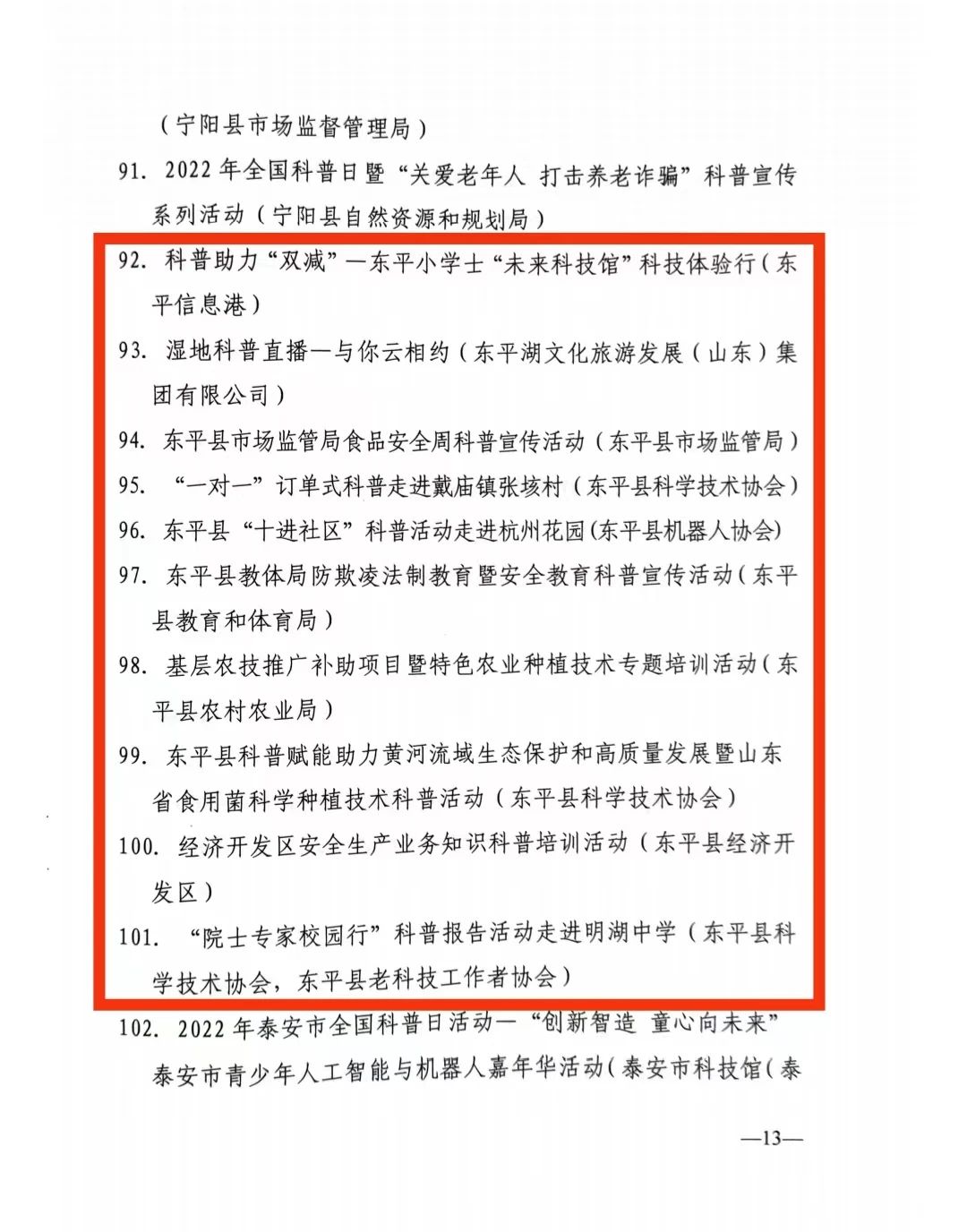 2022年12月1日,泰安市科协公布《关于表扬泰安市2022年全国科普日活动优秀组织单位和优秀活动的通知》, 其中,东平信息港公益协会科普助力“双减”-东平小学士“未来科技馆”科技体验行活动,荣获市级优秀活动。