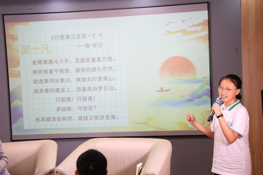 接着,卜老师又提出第二个问题:“李白读过哪些经典”。在《上安州裴长史书》中,李白写道:“少长江汉,五岁诵六甲,十岁观百家。轩辕以来,颇得闻矣。常横经籍书,制作不倦,迄于今三十春矣”。其中,李白表明自己年少时曾背诵六十甲子,也曾熟读诸子百家文章。于是,卜老师向大家推荐朱自清《经典常谈》一书,其中包含了许多李白所读的经典篇章,并以《周易》《说文解字》等为例进行了简要说明。他依次邀请吴一凡同学、康淑琪同学、张若溪同学上台朗诵《行路难三首其一》《拟古十二首·其九》《上李邕》等诗后,又关联到《经典常谈》一书的其他部分,如《尚书》《诗经》《诸子》等,让我们看到一个在中华经典中浸润成长的李白。同时,结合《经典常谈》中的最后部分,探讨白话文运动,交流五四以来,白话文大家一直倡导的阅读文言和书写白话的重要价值。