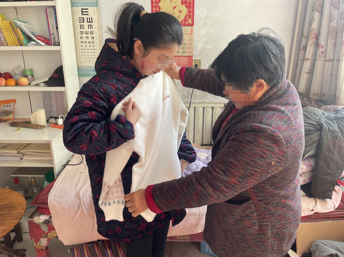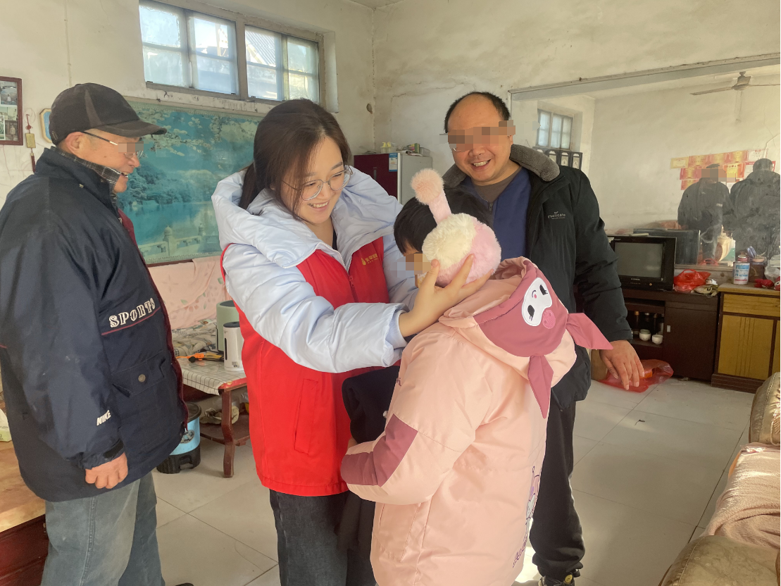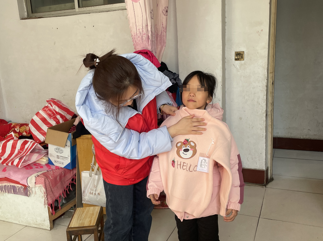 凛冽的寒风挡不住关怀的脚步,深冬的严寒冷却不了一颗颗送温暖的心,走访中,志愿者与孩子们亲切交谈,叮嘱他们天气变化,多穿衣服做好保暖,并为他们送去爱心人士赵先生资助的棉衣、棉裤、耳暖等爱心物资和助学金共计1100元,孩子们喜滋滋地穿上暖和的新棉衣,脸上露出快乐的笑容。送一件温暖冬衣对于每个人来说,家是温暖的,对于留守儿童来说,一件温暖的棉服不仅仅温暖了这个寒冷的冬季,更温暖了孩子们的童心。