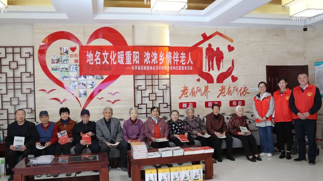 活动中,地名文化保护志愿者精心制作播放了“蓆桥村和秃尾巴老李的传说”“半倒井的来历”“马凉庄的传说”等地名趣闻故事,让老人们听乡音、忆乡情。随后,地名文化志愿服务队志愿者们将募集的《千年古县 水韵东平》《东平地名文化》《东平红色革命故事》《东平湖》等7册120余本丛书向老人发放。