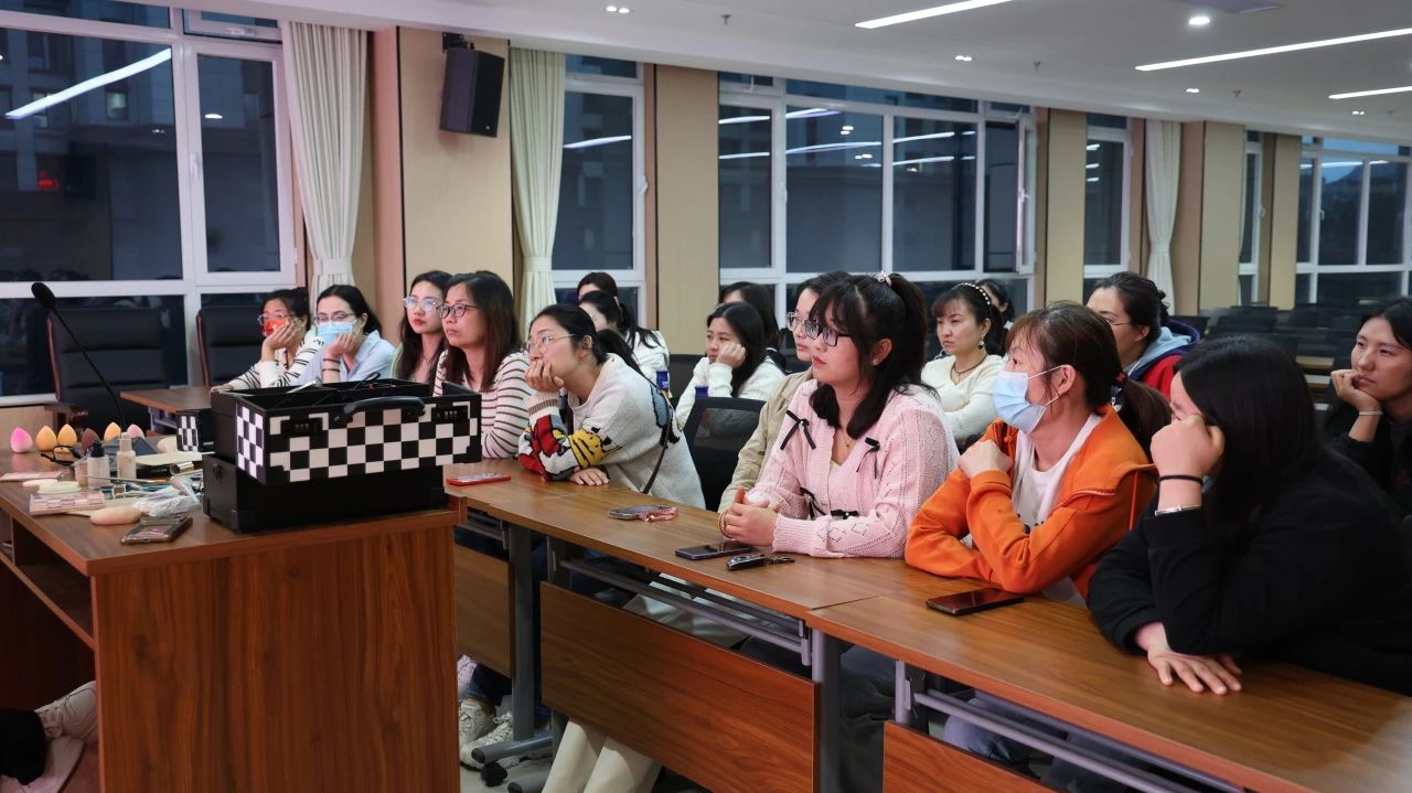 在化妆课堂上,宫园园老师从最基础的化妆审美、化妆工具产品辨识开始讲解,让大家更全面地了解自己,了解化妆步骤。随后跟学员们讲解色彩学的基础理论知识,如何根据自己的肤色、脸型选择适宜得体的妆容。为了能够更加直观地让学员观摩学习,老师现场邀请学员进行美妆示范教学。