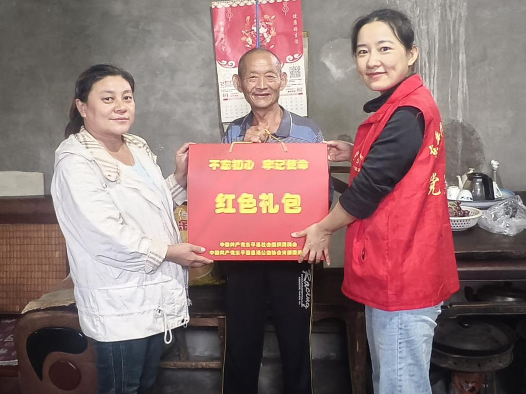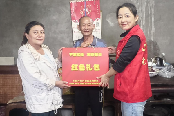 活动中,志愿者为老人送上精心准备的“红色礼包”。礼包内含T恤、保温水杯、毛巾等生活用品,既贴合老人日常需求,又承载着节日的祝福。每到一户,志愿者都与老人亲切交谈,详细询问他们的身体状况和生活需求,耐心倾听他们的心声。接山下套村的陈大爷接过礼包时激动地说:“真是感谢党的好政策,总是惦记着我们”!