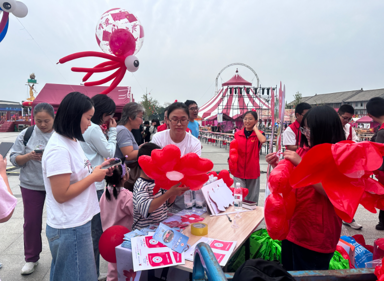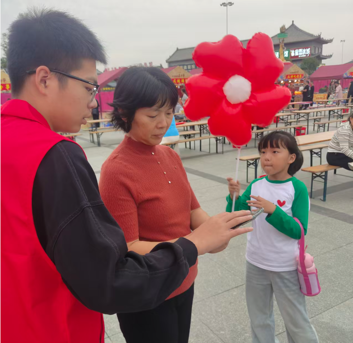 协会特别设计的“送你一朵小红花”拍照框前,孩子们更是兴致勃勃,接过志愿者递来的小红花,在古色古香的宋城背景下拍照打卡,用童真笑容为公益打call,让“爱”成为这个国庆假期里最特别的打卡记忆。现场,既有亲子参与,也有年轻情侣扫码后比出爱心手势。市民张先生笑称:“孩子玩着就把善事做了,这种教育方式特别好!”