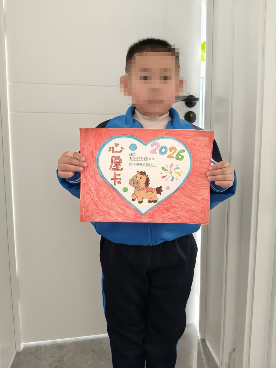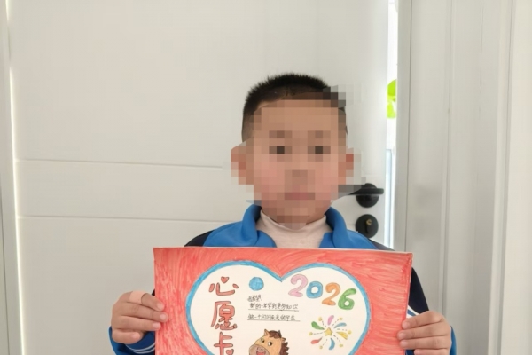 “闺女,真是太谢谢你们来看孩子!有你们的帮助,我和她爷爷心里宽心多了,村里赵书记也一直挂心孩子!”在走访过程中,志愿者见到了与七十多岁爷爷奶奶共同生活的孩子小宋(化名)。小宋父母多年失联、杳无音信,两位老人默默扛起生活重担。见到志愿者的到来,老人眼含热泪,紧紧握住志愿者的手,反复表达感激之情。而在小宋的书桌一角,一张写有“2026,愿我们都能做一个闪闪发光的自己”的心愿卡,不仅承载着这位“千帆筑梦”项目一年级励志小同学的憧憬,更展现出困境学子向阳生长的力量。