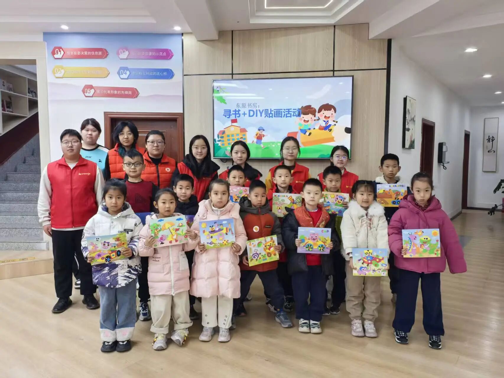 为激发小学士阅读兴趣、培养创新思维,1月31日,东平信息港公益协会在东原书房开展”寻书探秘+创意贴画DIY“主题系列活动。活动共吸引40名小学士参与,在书香与创意交织的沉浸式场景中开启趣味成长之旅。
